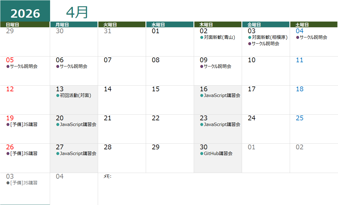 新入生の皆さんに向けた説明会や講習会、BBQ、ハッカソンなど、様々なイベントを計画中です。
